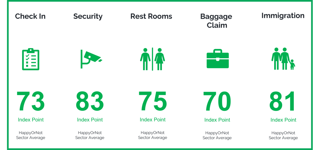 The image below is of the the overall industry average benchmark for Airport Operations satisfaction levels, based on the HappyOrNot Index. You can see that there is huge opportunity for the average performing airport to increase satisfaction and revenue by prioritising the measurement of Customer Experience.